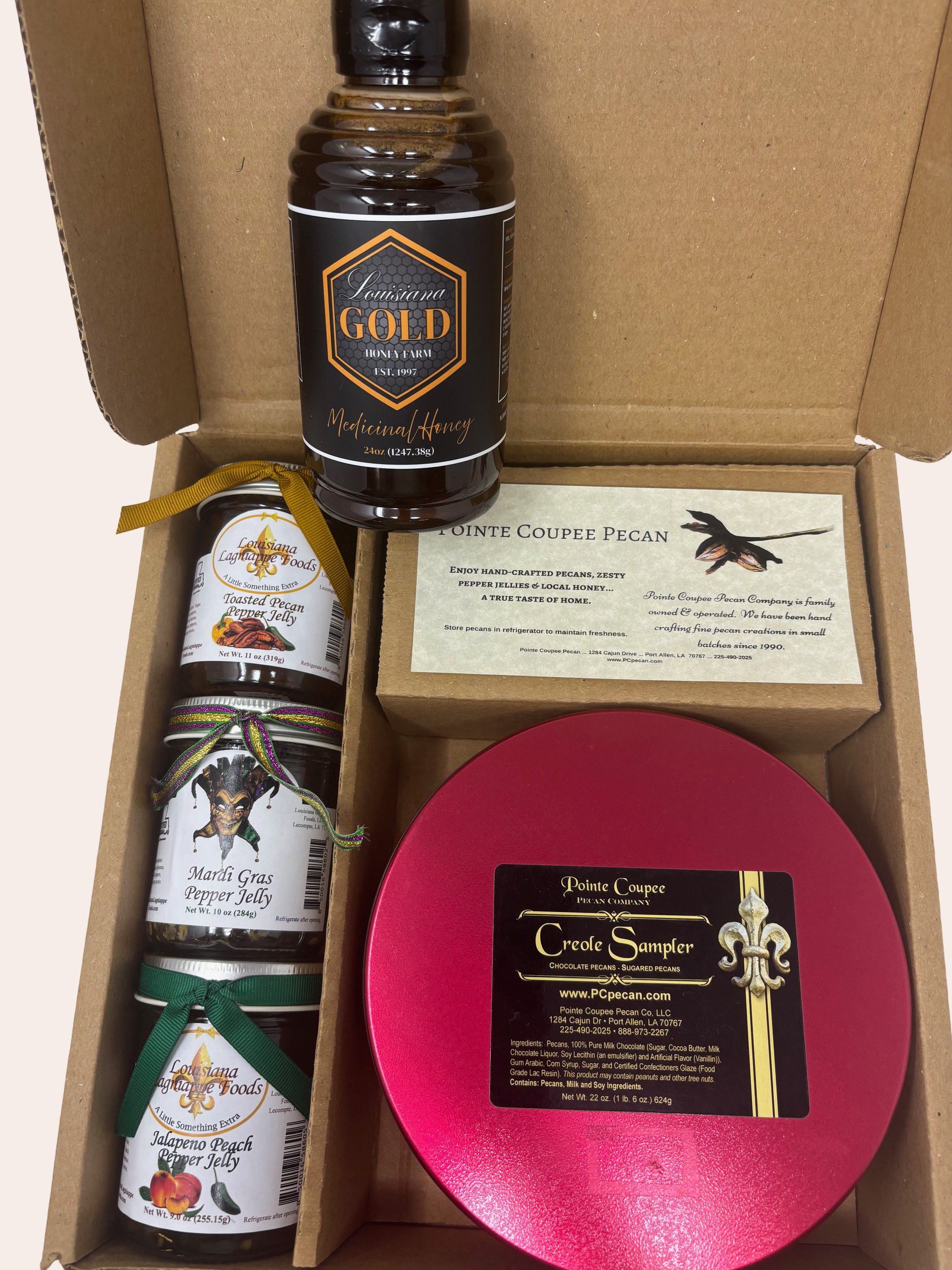 Includes 24oz Honey, Toasted Pecan Pepper Jelly, Mardi Gras Pepper Jelly, & Jalapeno Peach Pepper Jelly. Our three most popular Jelly Flavors.
